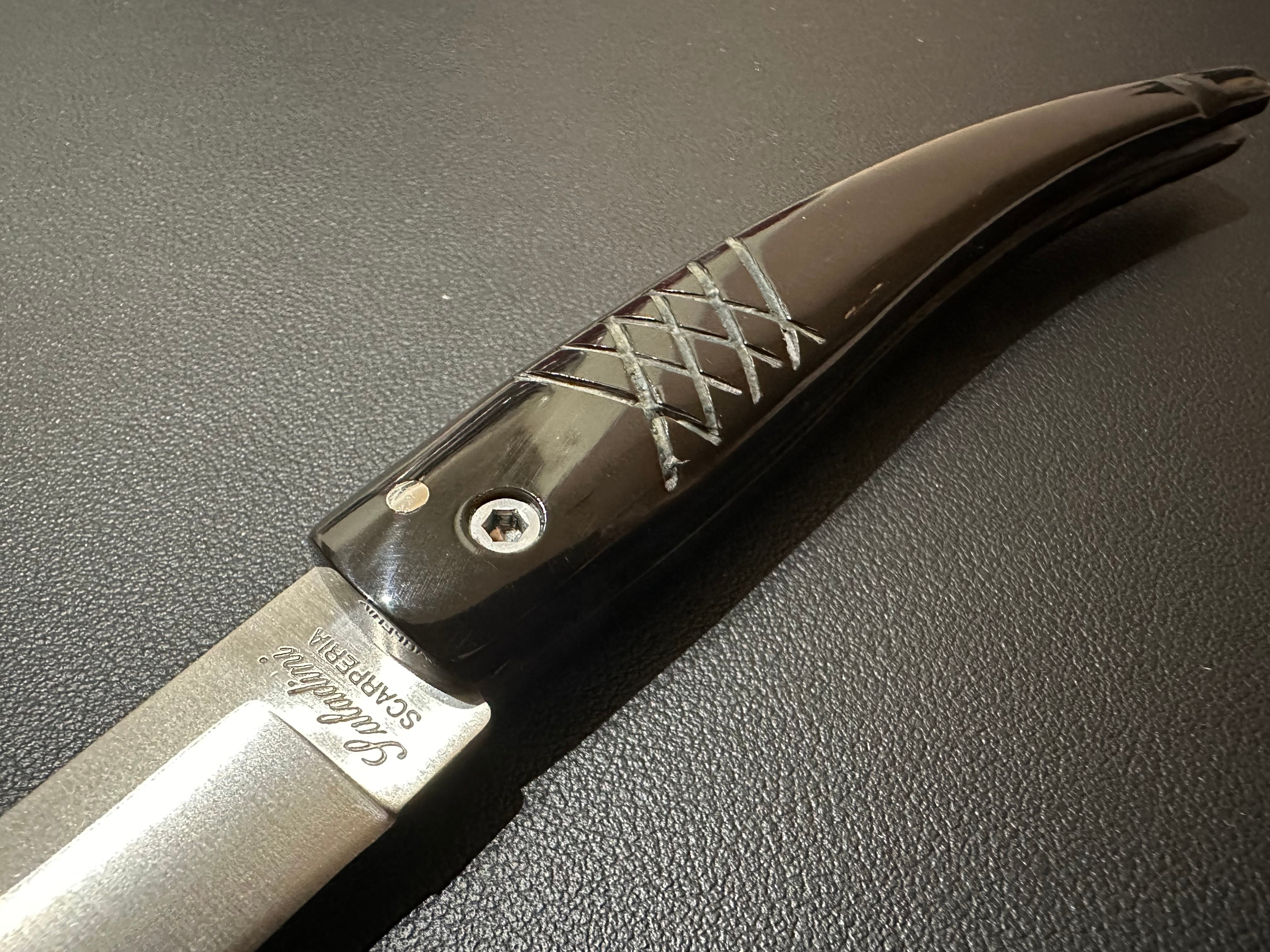 バネは使用せず、刃を開くためのストップピンが付いており、ステンレススチールのネジで硬さを調整します。 柄は一枚板でできており、彫刻や溝加工で装飾されています。