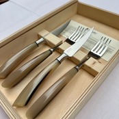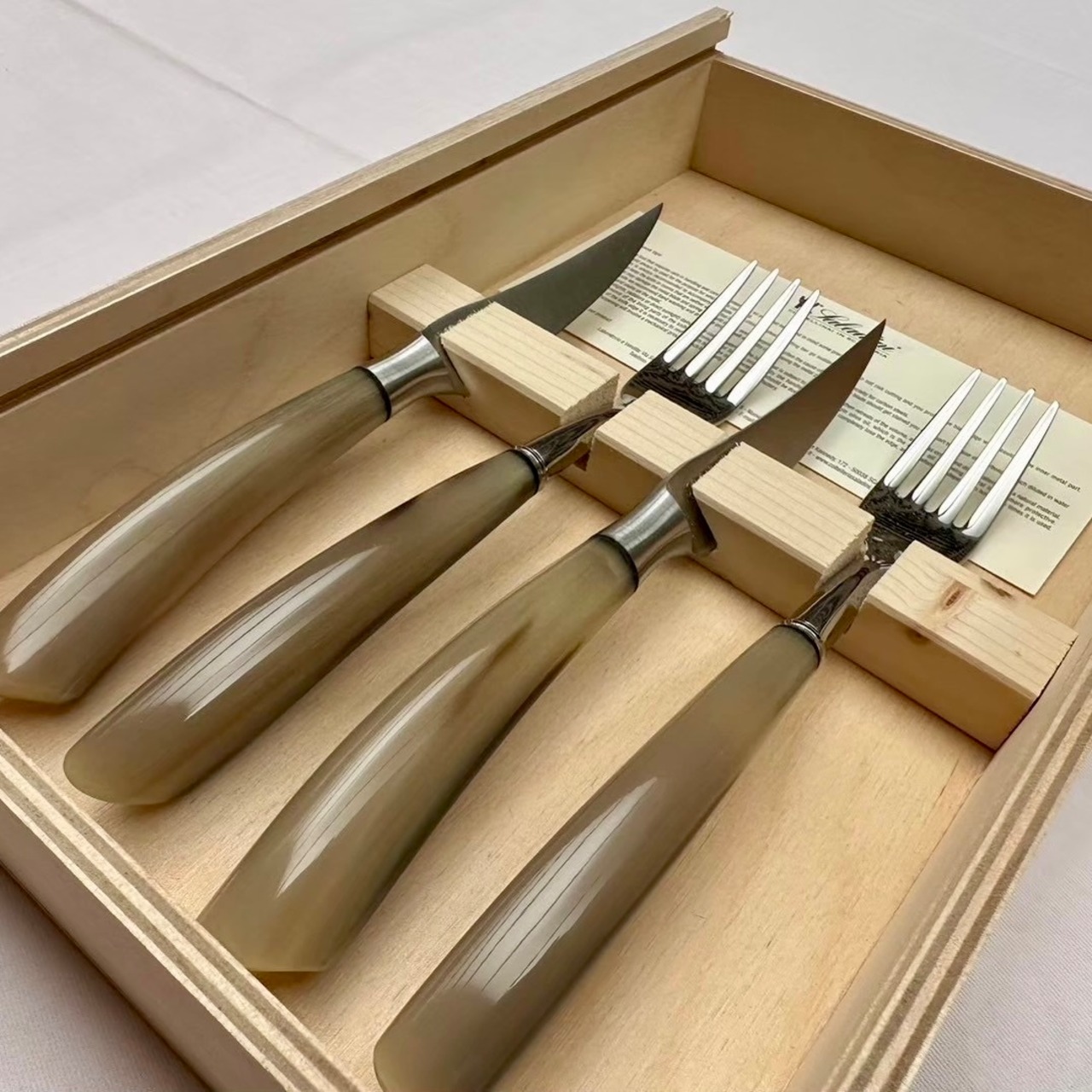 0001. ステーキ用テーブルナイフ&テーブルフォーク『牛角・ペア4本セット』専用特注木箱・BOX・リボン付き